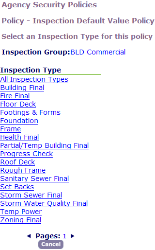 7. Click the link for the inspection type you want to work with. To assign security settings for the entire inspection group, click the All Inspection Types link.
