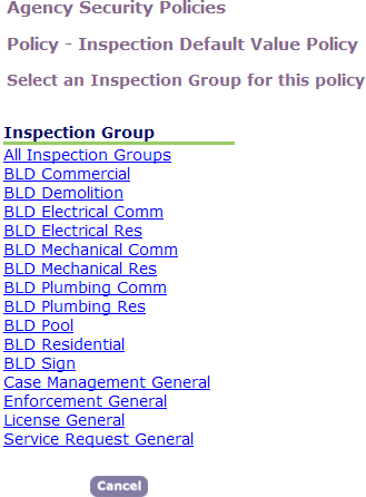 6. Click the link for the inspection group you want to work with. To assign security settings for all inspection groups, click the All Inspection Groups link.