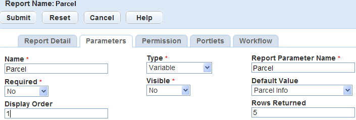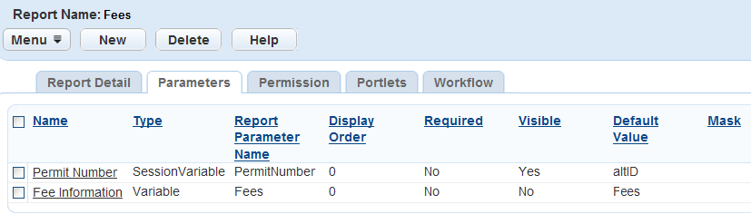To pass Accela-provided parameters, you must add parameters in the Parameters portlet.
