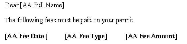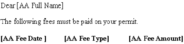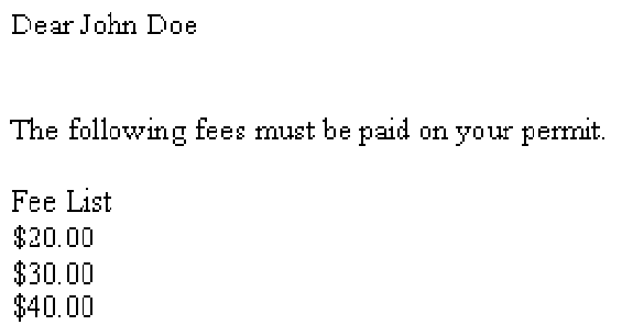 In Figure 4 Civic Platform replaces <$Fees$> with a list of fee values returned from executing the following SQL statement: