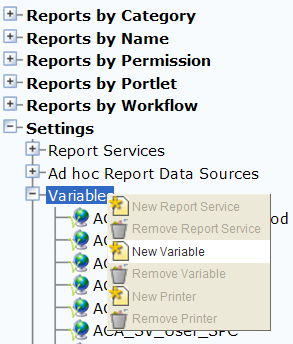 2. In the navigation tree, expand the Settings node and click Variables to create a variable within Report Manager using super agency user rights.