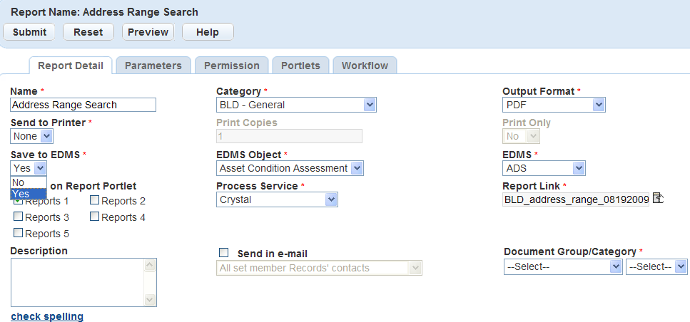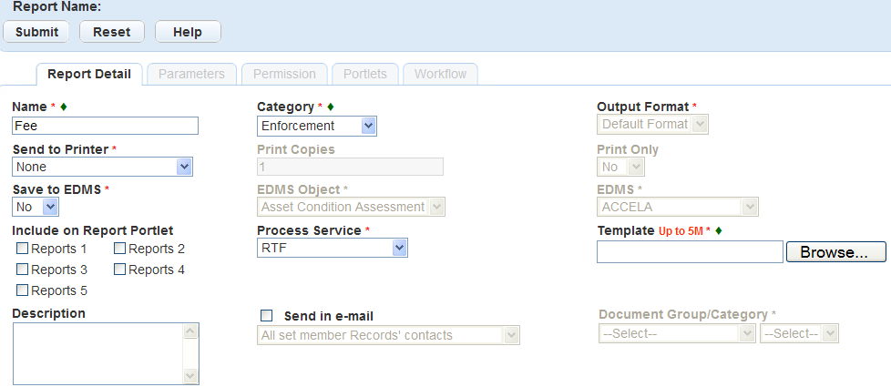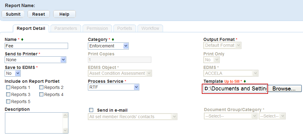 You can develop letters and forms using Microsoft Word templates that you save as Rich Text Format (RTF) files. You add these files to Report Manager; they are accessible from the Report Portlet or portlet-specific reports menus. You can also save these files to an Electronic Document Management System (EDMS). You also define the EDMS object to save the report to a record, parcel, workflow, asset condition assessment, inspection, or set. For example, you can save an approval letter to build a new structure to the building permit record. For more information and instructions, see Saving Reports to a Document Management System.