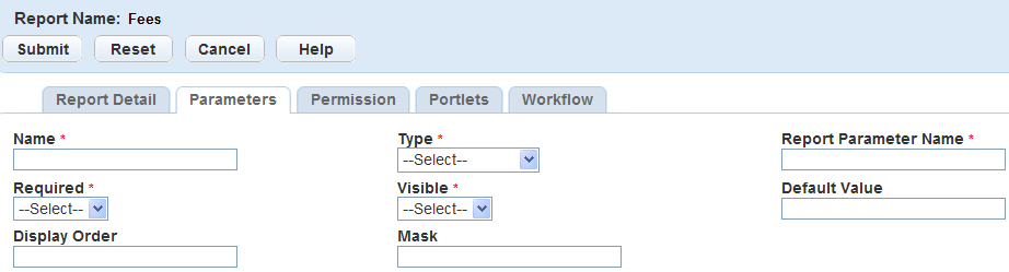 13. To add parameter values to pass to the report, click New. For information and instructions in Setting up Report Parameters.