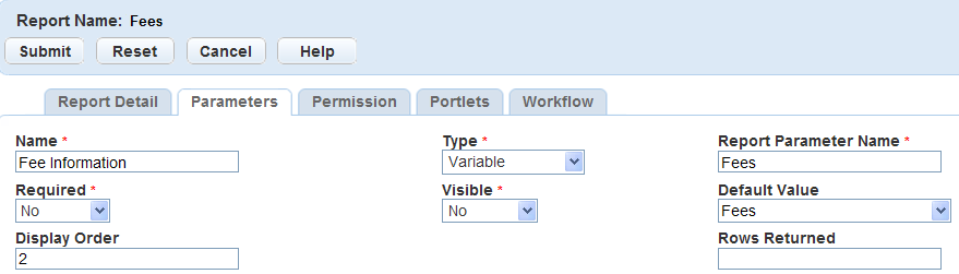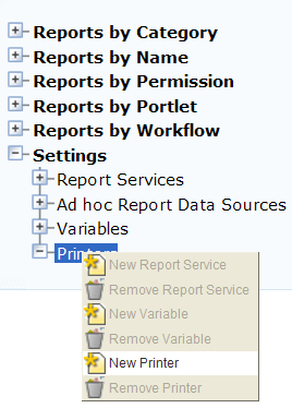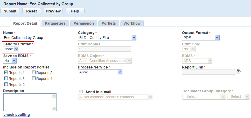 To add a default printer to a specific report, select the printer in the Report Detail form portlet. For more information on the Report Detail form portlet, see Adding a Report.