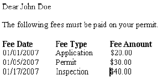 Civic Platform replaces the heading for the variable <$Fees$> with the name of the column alias “Fee List” from the SQL query. If you do not use an alias, the column name [FEE_VALUE] displays as the column label.