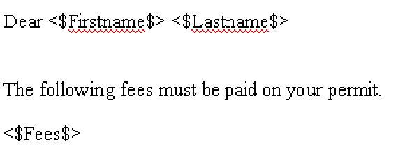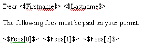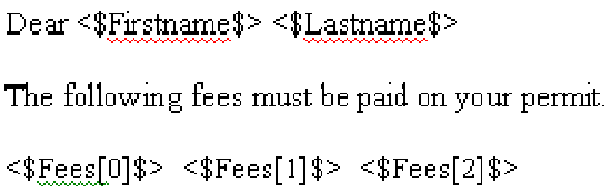 Example1. rtf in Figure 3 is an example of an RTF template that uses a variable named <$Fees$>. At runtime, Civic Platform replaces <$Fees$> with the results of an SQL query that returns a single column and multiple records. For an example, see Figure 4.