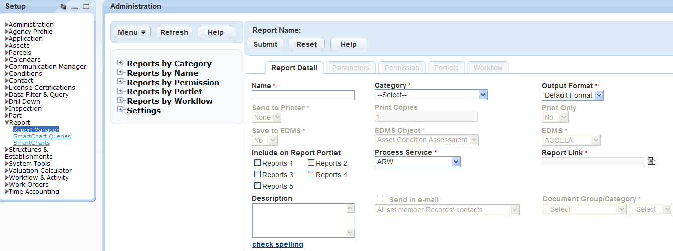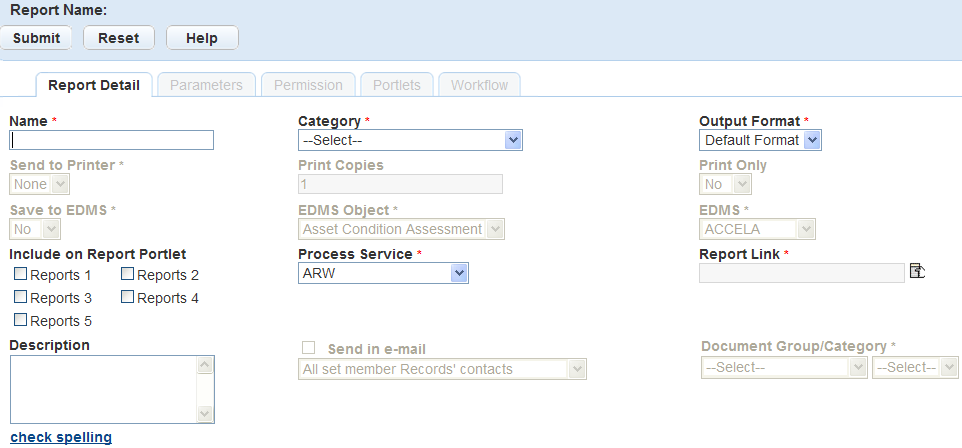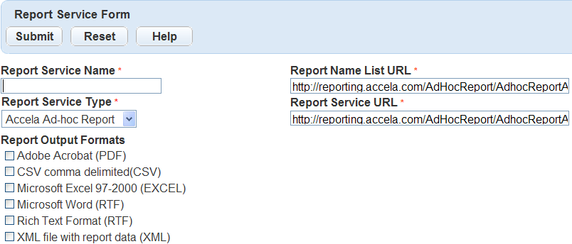 Report Service Name Enter the name of the report service. Use a name that describes the executable. This name appears in the Report Service drop-down list in the report detail form. For example, enter MS Excel EXE.
