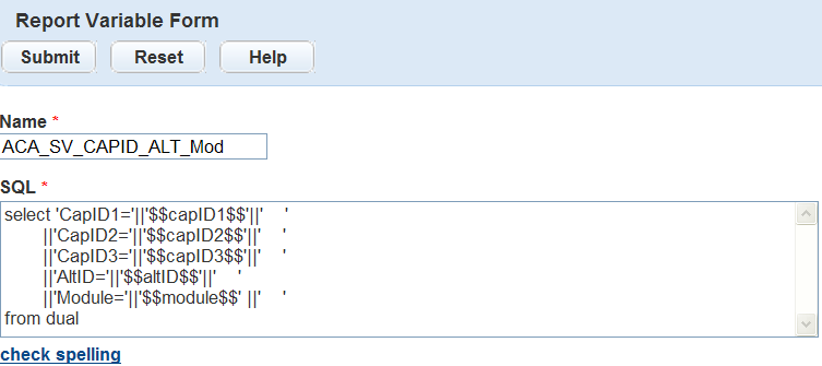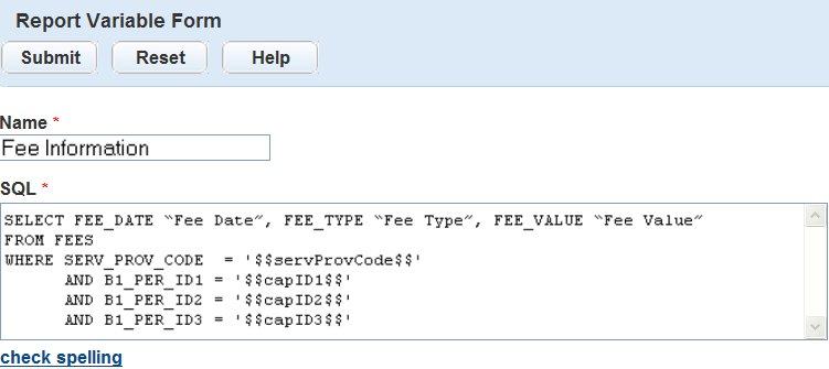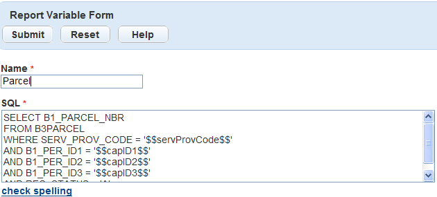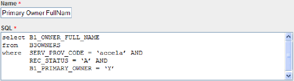 Variables are raw database scripts that you execute directly against the Civic Platform Oracle or MS SQL Server database, outside of a report writer or a development tool. You can incorporate these scripts into a report or report template as parameters and populate them with data from Civic Platform. For example, to extract the full name of the primary owner, use the database script displayed in Figure 1 in the report variable form.