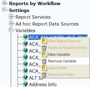 To remove a variable, you must first remove the variable from any reports that use it, specifically RTF template and URL reports. After you remove variable it is no longer available to any reports.