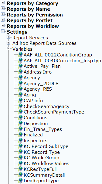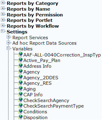 Civic Platform displays the variables available within Report Manager.