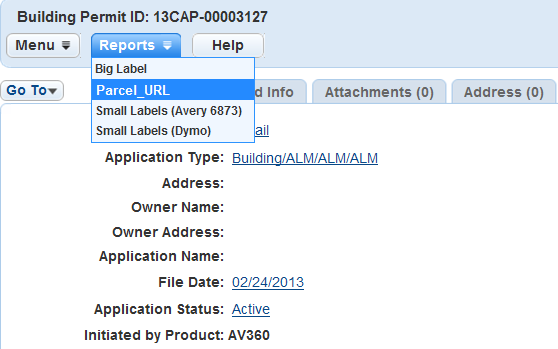 Open a permit record, click the Reports menu, and choose the report from the drop-down list.
