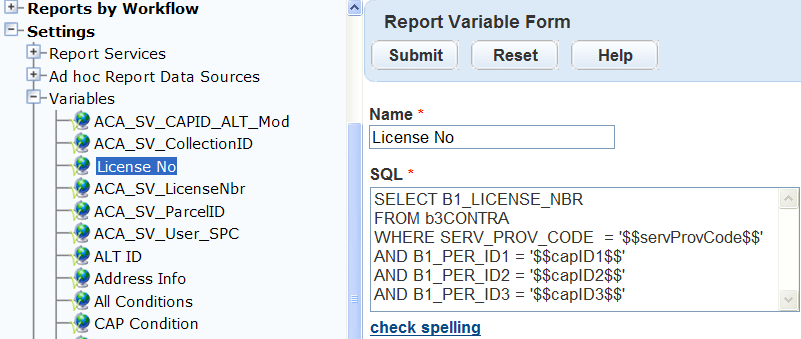 Variables are raw database scripts Civic Platform executes directly against the Civic Platform Oracle or MS SQL Server database outside of a report writer or development tool. You can use these scripts to pass parameters to a URL report, like variables in an RTF report. Before you can run a report, you must set up the variables and a URL report service in Report Manager. For information on how to set up a variable, see Using Variables in Reports. For information on how to set up a report service, see Setting Up Report Services.