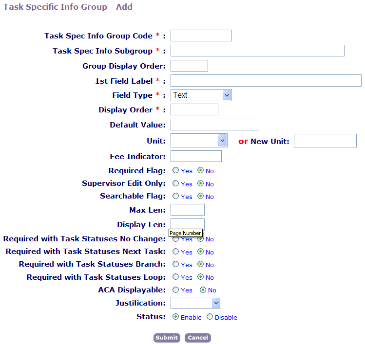 When you create a new Task-Specific Information group, you specify the group code and its name, as well as the first field that you want to include in the group. You can set up other information about the field, including the field type and a default value. You can set up additional fields, change the order of fields in the group, and change any values when you edit the task-specific group.