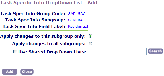1. Locate the task-specific information group to which you want to apply a shared drop-down list. For instructions, see Editing a Task-Specific Information Group.