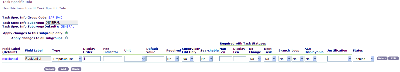 After you create a Task-Specific Information group, you might need to change it. You can add or delete fields; change the field type, display order, and the default value. You cannot however change the group code, group name, or the field labels when you edit the group.