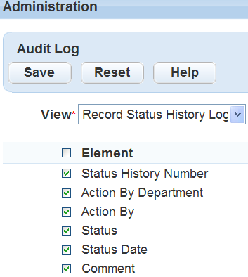3. Select the Record status history elements you want to include in the Record Status History audit log. You can also click the Element check box to select all available elements. You must select at least one element for the audit log.