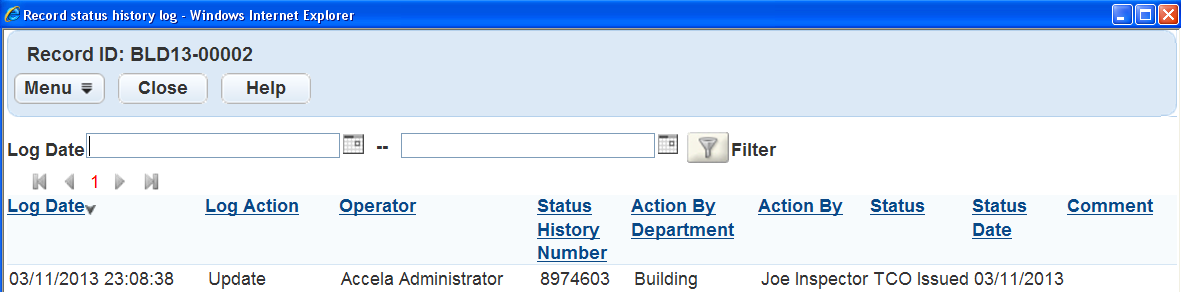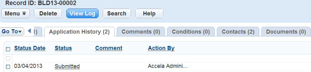 Comment Any comments related to the application status history update. The comments that display in the audit log can be those a user entered manually or those that Civic Platform populates by predefined Standard Comments.
