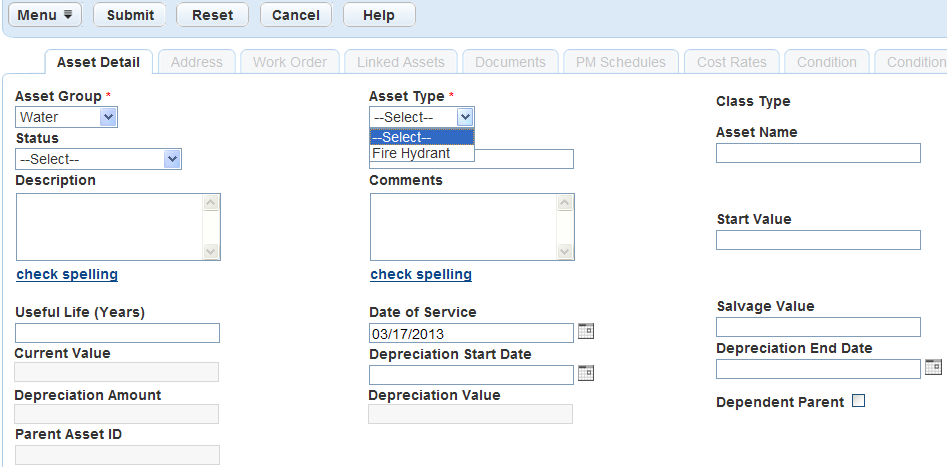 Create a new asset type each time an agency gets a new type of asset. For example, your agency adds gas flow meters to the natural gas lines to track the amount of gas consumed each month. Add flow meters as an asset type. The agency can now track and maintain the flow meters by associating work orders to it. You can also maintain the assets in the legacy Accela GIS.