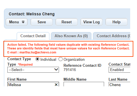 When users add or update a reference contact that has duplicate identifier field value with an existing reference contact, an error message displays indicating the conflict.