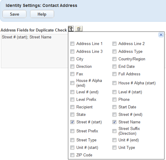 Click the field selector next to the Address Fields for Duplicate Check label.