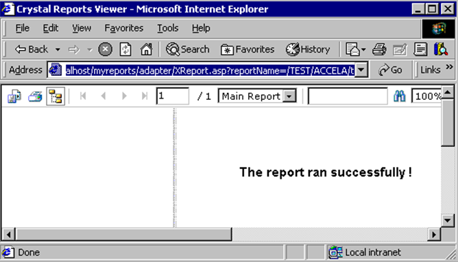 18. Enter this URL in a browser's address field, but with your environment name (TEST) and agency name (ACCELA): http://localhost/Accelareports/adapter/XReport.asp?reportName=/TEST/ACCELA/test.rpt