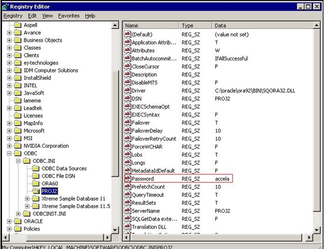 2. Open the Windows Registry, find the Data Source Name in ODBC.INI, and set the password.
