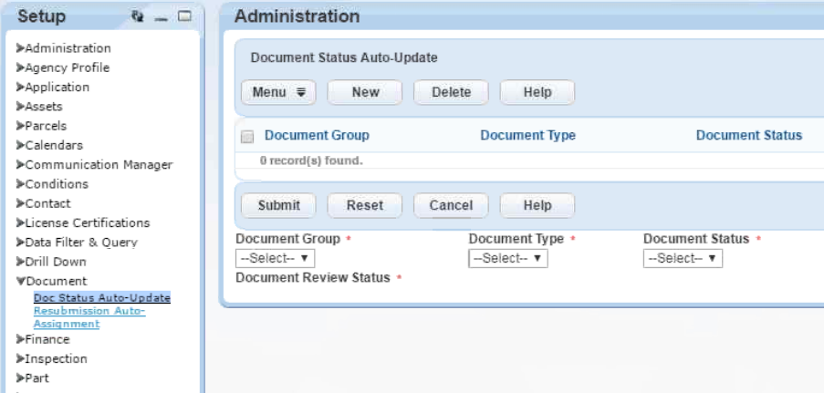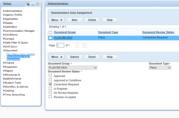 - Navigate to Civic Platform Administration > Setup > Document > Resubmission Auto Assignment.