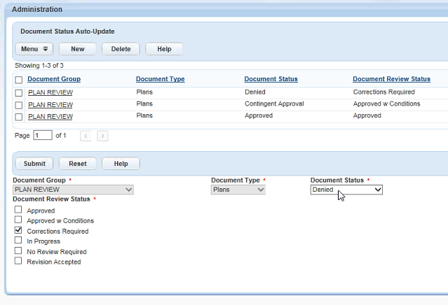 In the following example, the Plan Review group has six plan reviewers who are reviewing a Document Type "Plans." When all six plan reviewers select the Document Review Status "Corrections Required," Civic Platform updates the overall Document Status to "Denied."