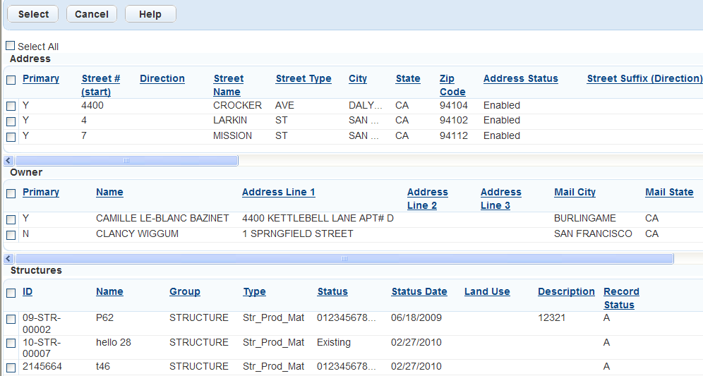 Agencies can configure Civic Platform such that any address, owner, structure, or establishment record associated to a parcel populates to a record when you associate the parcel to the record. Contact your agency administrator for information about your agency’s configured functionality for synchronizing reference data.