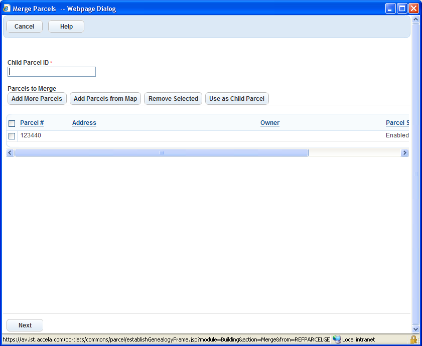 If you want to use a parent parcel as the child parcel of the merge, select the parent parcel and then click Use as Child Parcel.