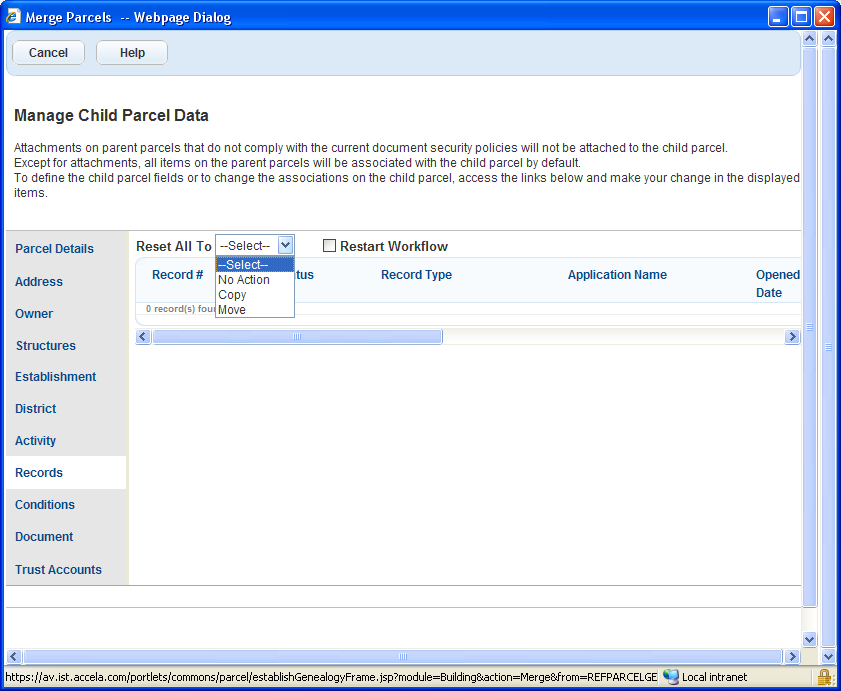 9. To restart the application workflow on child parcels, select the Restart Workflow option in the Records tab.