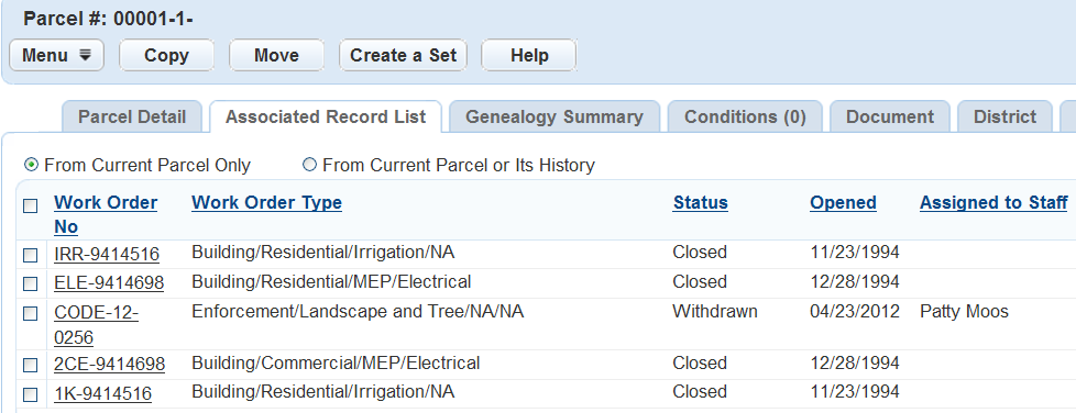 Civic Platform displays the records associated with the selected parcel and its parents, grandparents, or ancestors on the Associated Record List tab.