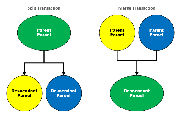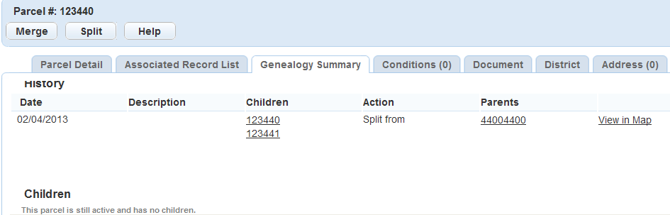 If the selected parcel is active, then you may be able to split the parcel or merge it with other parcels through the Genealogy Summary page. Based on your agency’s user group settings, you may or may not have access to the Merge and Split buttons on the Genealogy Summary page. Contact your agency administrator for more information.
