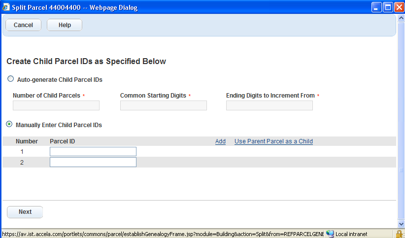 2. Enter a parcel number in the Parcel ID field for each child parcels.