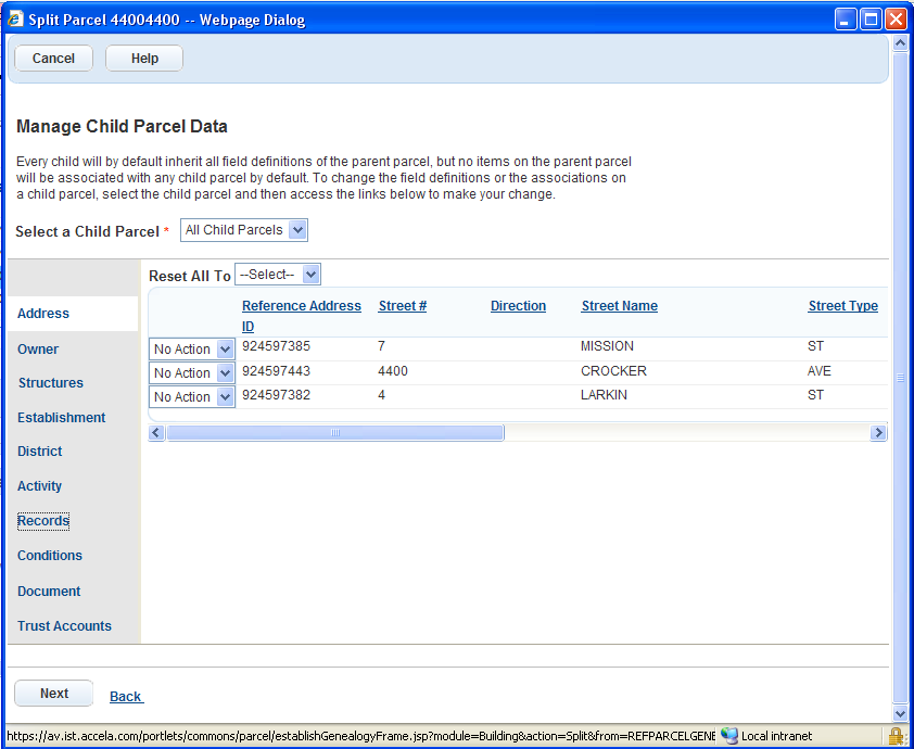 8. If the parcel has any associated addresses, owners, structures, or establishments, one of the following occurs, depending on your agency’s settings: