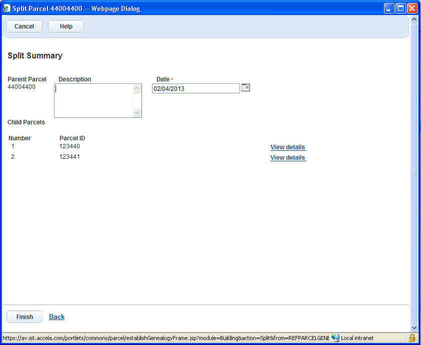Civic Platform splits the parcel as you specified and establishes a parcel genealogy transaction. If you chose to retain parent parcel data, Civic Platform returns to the Genealogy Summary tab for the parent parcel. Otherwise, Civic Platform returns to the Genealogy Summary tab for the child parcel using the parent parcel number.