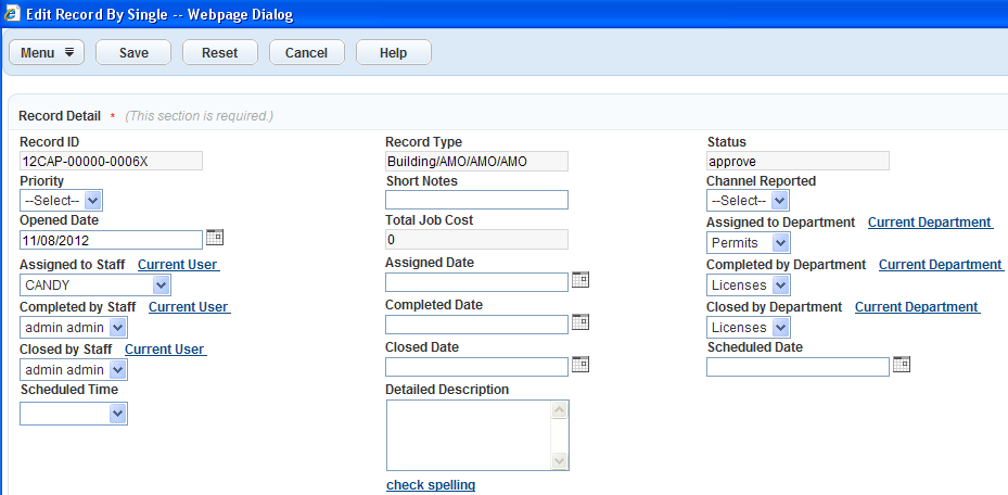 Civic Platform opens the application intake form. The parent record information copies to the child record.