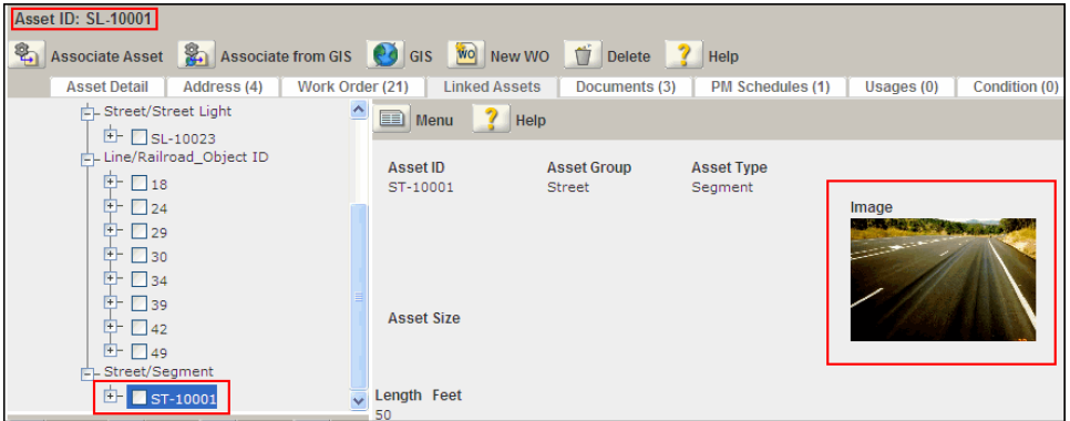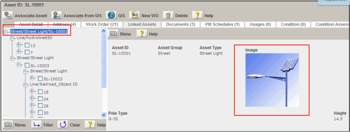 When a child or parent asset is selected from the linked asset navigation tree, the display image for the linked asset appears in the linked asset detail portlet.